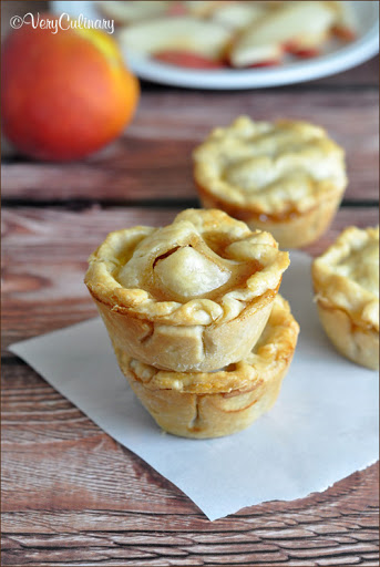 With your first crust, cut out 4, 5-inch rounds and gently press into each muffin cup. Evenly distribute the peaches into each cup.