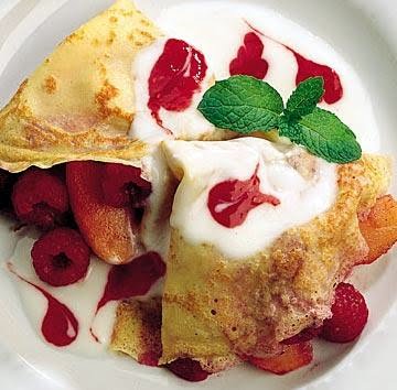 Fold crêpes in half, then divide onto serving plates. Top crêpes with filling and fold crêpes over. Divide yogurt and raspberry sauce among plates. Garnish with mint, if desired.
