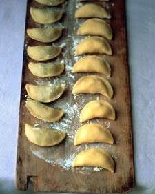3.To form dumplings, place a circle of pierogi dough on a work surface, and put a heaping teaspoon filling toward the front of the circle. Moisten the edges of the dough with water, and fold in half around the filling to form a semicircle, firmly pinching the edges closed. Set aside on a lightly floured baking sheet. Continue to fill and form pierogi, keeping them covered with plastic wrap, until all the dough is used up.