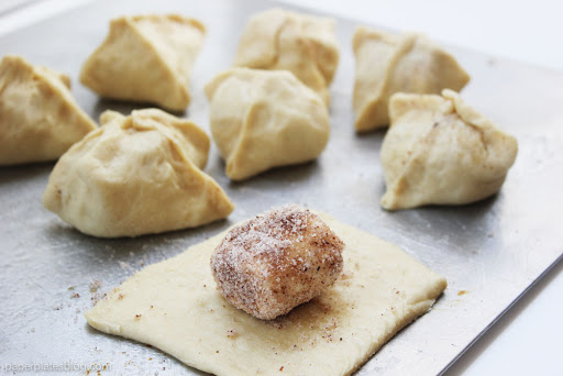 Sprinkle a bit of melted butter and cinnamon sugar on top of the buns, sparingly.