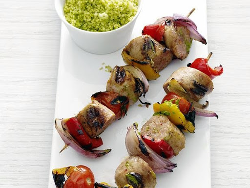 4)Toss the couscous with half of the remaining pesto and season with salt and pepper. Serve with the skewers and the remaining pesto, for dipping.