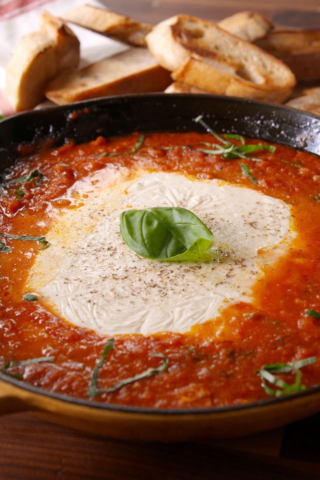 Add the mozzarella to the center of the dish and transfer to the oven. Bake for 20-25 minutes, until the cheese is melty. Sprinkle pepper over the mozzarella and garnish the skillet with more basil. Serve warm with toasted bread.