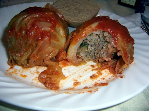 2)Mix all ingredients together in bowl with hands. Can either wrap mixture in each leaf or put is roaster casserole style. Cover bottom and sides of roaster with cabbage leaves. Put in mixture or wraps and cover with more leaves. Pour tomato soup and water over top. Bake for approx 2 hours.