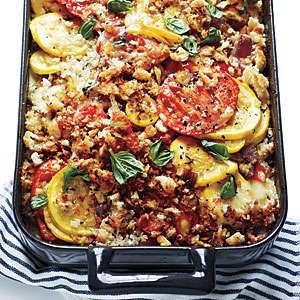 4. Place bread in a food processor; pulse until coarse crumbs form. Return skillet to medium-high heat. Add remaining 1 teaspoon oil to pan; swirl to coat. Add breadcrumbs; cook 3 minutes or until toasted. Arrange tomatoes evenly over vegetable mixture. Top evenly with breadcrumbs. Bake at 375° for 40 minutes or until topping is browned. Sprinkle with remaining 1/4 cup basil.
