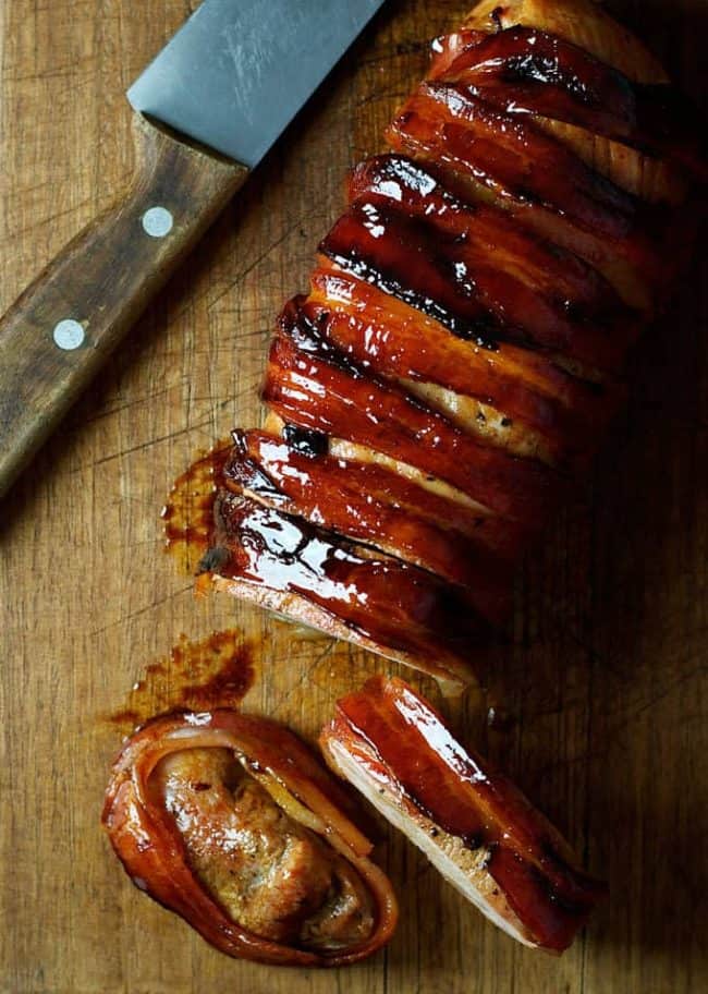 Lay the bacon next to each other on a cutting board, slightly overlapping (per photo below). The width of the bacon should be enough to wrap the length of the pork.