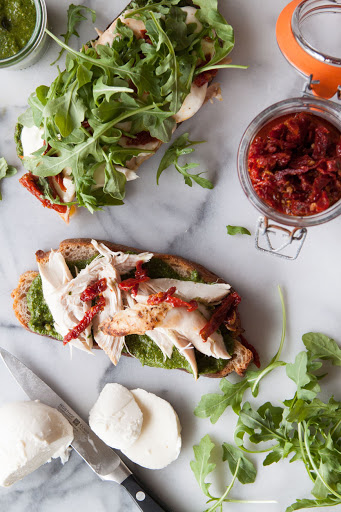 > Slather 1/4 cup of the arugula pesto on the top of each piece of toast and add the sliced turkey and fresh mozzarella. Season with salt and pepper. Place the 2 tartines into the oven and broil for 1-2 minutes until the cheese just starts to melt and bubbly. Remove from the oven and top with some fresh arugula. Serve immediately.