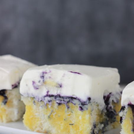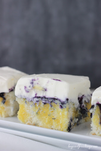 This Blueberry Cheesecake Poke Cake is a fresh vanilla cake filled with cheesecake pudding and a sweetened blueberry sauce. Best of all, it is topped with a cream cheese whipped cream.