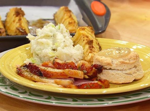 After the ham’s been cooking for an hour, baste it with half of the glaze, then roast another 30 minutes uncovered. Baste with remaining glaze and roast 15 minutes more. Remove ham from oven and let stand under parchment and foil for up to 30 minutes. Carve and serve with Broiled Pineapple, Mashed Potatoes and Leeks, and Warm Biscuits with Honey Butter alongside.