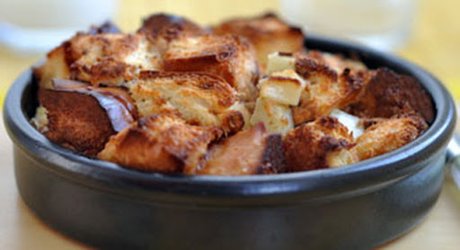 In a large bowl, combine bread, raisins, and apples. In a small saucepan over medium heat, combine brown sugar, cups milk, and butter. Over medium heat, stir until butter is melted. Pour over bread mixture in bowl and toss to combine, pour into prepared baking dish.
