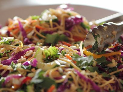 Mix together the cooked spaghetti, carrots, peppers, bean sprouts, cucumbers, scallions, cilantro, napa cabbage, purple cabbage and kale. Add the peanuts and toss together.