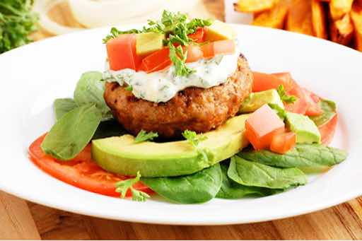 Heat the grill to medium-high heat and cook the burgers for 5-6 minutes on each side, or until cooked through. Serve the burgers over sliced tomato, spinach, and avocado.
