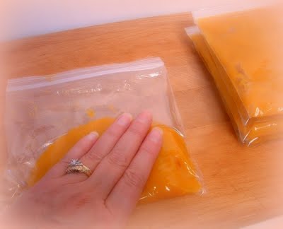 Freeze in one-cup increments by measuring into a Zip-Loc bag, then gently press flat and squeeze out any air. This will allow you to stack the puree for easy storage.