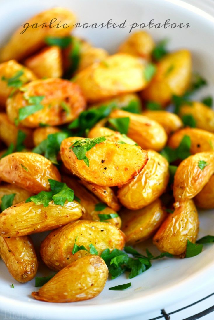 These Garlic Roasted Potatoes are the perfect side dish! Perfectly crispy on the outside and tender and fluffy on the inside, these Garlic Roasted Potatoes will soon become a family favorite! This versatile recipe is great with all manner of entrees and can be scaled up to feed a crowd.