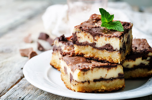 These decadent bars are sure to satisfy even the pickiest sweet tooth. Rich layers of chocolate ganache and silky cheesecake are held together by a vanilla cake crust that has browned to perfection. Excellent treats to make ahead of time, these babies can hold their own at a candle-lit dinner for two or in the center of the table at the next potluck. We can't help but devour these whenever we make them, so be forewarned!