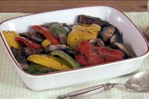 CUT peppers into quarters; place in large bowl. Add mushrooms and 1/4 cup of the dressing; toss to coat. Meanwhile, preheat grill to medium heat.