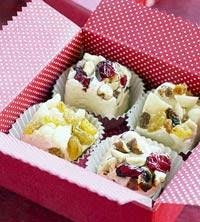 6. Immediately stir 2 cups of the fruit and nuts into candy. Quickly turn candy into prepared pan; spread to corners. Sprinkle top with remaining 1 cup fruit and nuts. Lightly press fruit and nuts into warm mixture. While still warm, score into pieces. Let stand about 3 hours or until completely cool. When cool, use foil to lift candy from pan. Cut into pieces using a hot knife. Wrap in plastic wrap. Store in refrigerator up to 1 week or in freezer up to 4 months. To serve, unwrap and place in waxed candy cups or bonbon cups. Makes 35 pieces.
