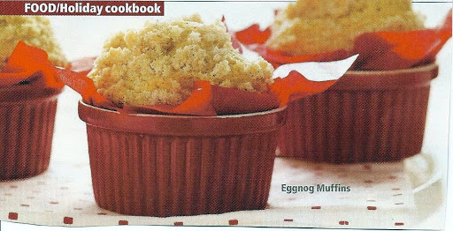 IN ANOTHER BOWL COMBINE EGGS EGGTNOG MELTED BUTTER VANILLA AND RUM EXTRACT ADD EGG MIXTURE TO FLOUR MIXTURE STIR JUST UNTIL MOISTENED MIXTURE WILL BE LUMPY SPOON BATTER INTO MUFFIN CUPS FILLING 2/3 FULL TOP WITH STREUSSEL TOPPING BAKE AT 375 FOR 18-20 MIN TILL A TOOTHPICK COMES OUT CLEAN