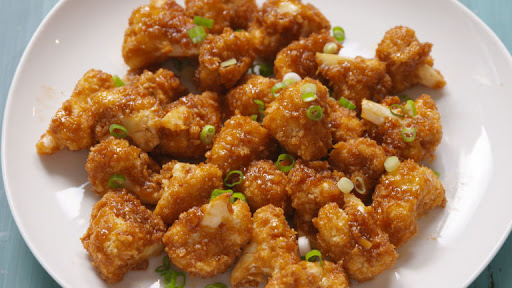 2 In a large bowl, combine flour and cauliflower, toss until fully coated. Set up a dredging station: In one bowl, add panko breadcrumbs and in another bowl whisk eggs and add 2 tablespoons water. Dip cauliflower in beaten eggs, then panko until fully coated. Transfer to a parchment-lined baking sheet and season generously with salt and pepper. Bake until golden and crispy, 20 to 25 minutes.