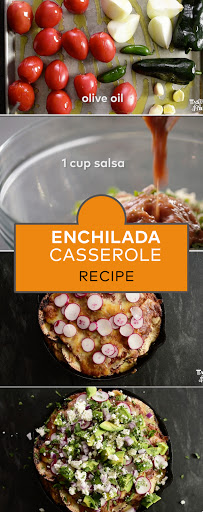 To assemble the casserole, have 15 charred corn tortillas, 1½ cups of shredded Monterey Jack cheese, the chicken mix and remaining salsa at the ready. For the first layer, spread a spoonful of salsa on the bottom of an 8-inch cast-iron pan or other circular baking dish. Layer 5 corn tortillas, overlapping if necessary. Top with half of the chicken mixture, ½ cup of cheese and 3 to 4 spoonfuls of salsa. Repeat. Top the last layer of tortillas with the remaining salsa and cheese. Bake for 30 minutes or until the cheese is melted and bubbling.