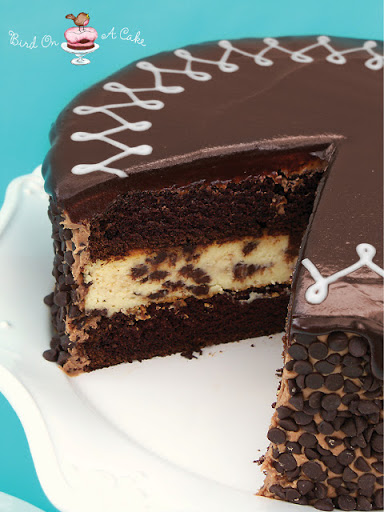 Level the tops of your chocolate cake layers. Place one of the cake layers on top of the cheesecake in the springform pan. Invert the pan onto a cake stand, release the spring and remove the pan and wax paper. Top with the second layer of cake and spread buttercream frosting over the entire cake.