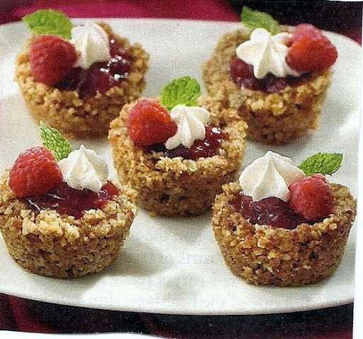 HEAT OVEN TO 375 IN A PROCESSOR PUREE PECANS OATS AND 2 TBS BROWN SUGAR ABOUT 30 SECONDS UNTIL FINE CRUMBS FORM STIR IN 4 TBS MELTED BUTTER PLACE 1TBS CRUMBS INTO MINI MUFFIN PAN AND PRESS BAKE 7 MIN UNTIL CRISP REMOVE FROM OVEN TRANSFER PAN TO RACK USING TEASPOON PRESS DOWN CENTER OF EACH CUP DIVIDE RASPBERRY JAM AMONG CUPS COOL COMPLETELY IN PAN