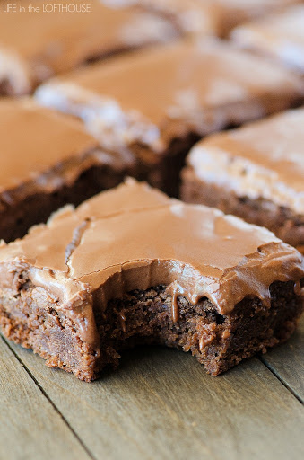 Bake 25 to 30 minutes or until toothpick inserted in center comes out clean. Remove brownies from oven and let stand 15 minutes before frosting. You want the brownies still warm when you frost them!