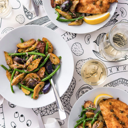 1. In a large pot, cover the potatoes with salted water, then bring to a boil over high heat. Cook the potatoes until tender, 10 to 12 minutes, then transfer to a bowl. Once the potatoes are cool enough to handle, slice each one in half lengthwise and set aside. Prepare a medium bowl of ice water. Add the green beans to the pot and cook until just tender, while retaining a slight bite, 3 to 4 minutes. Transfer to the ice bath until cool, then drain and set aside.