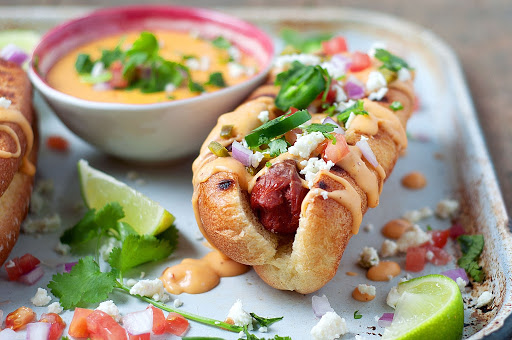 To serve, place the hot dogs in the buns and pour the queso cheese sauce over top. Sprinkle tomatoes, onions, cilantro, jalapenos and cotija/feta cheese over top and squeeze lime juice over top.
