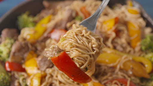 2. In a small bowl, whisk together soy sauce, garlic, lime juice, honey, and cayenne until combined and set aside. Add onion, peppers, and broccoli to skillet and cook until tender, 6 minutes, then add soy sauce mixture and stir until fully coated. Add cooked ramen noodles and steak and toss until combined. Serve.