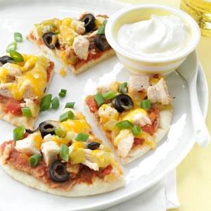 Preheat oven to 350°. Place pita breads on an ungreased baking sheet; spread with beans. Top with salsa, chicken, chilies and olives; sprinkle with cheese.