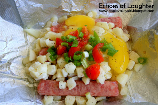 • Lay sausages or Canadian bacon on a double layer of foil that has been sprayed lightly with cooking spray.