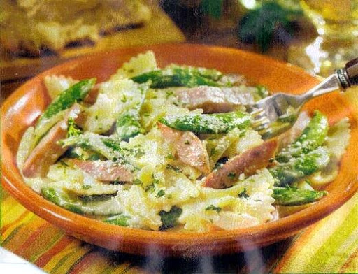 Cook pasta according to package directions,adding snap peas during the last 2 minutes of cooking time. Drain,reserving 1/2 cup pasta water. coat same pot with melted butter. Add onion;cook over medium-high until softened,4 minutes. Add ham;cook until lightly browned. Stir in cream. Cook,stirring until slightly thickened. Stir in cheese,pasta,snap peas and 1/4 tsp pepper;gradually stir in reserved pasta water until mixture is creamy. If desired,sprinkle with chopped parsley.
