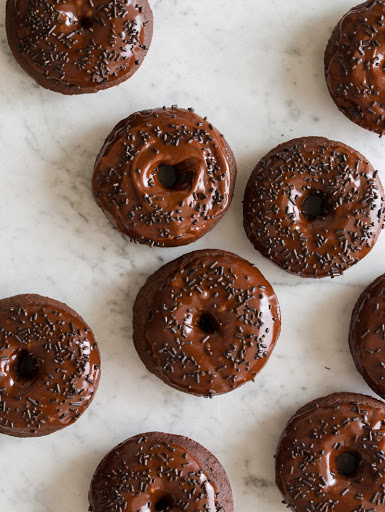 To assemble: Dip the tops of each doughnut into the warm glaze and shake to remove any excess glaze. Place doughnuts onto a cooling rack, glaze side-up and top with a small amount of chocolate sprinkles. Repeat until all doughnuts have been dipped and sprinkled. Allow doughnuts to sit for 10 to 15 minutes to allow the glaze to harden. Serve.