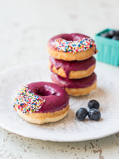 Lightly spray the doughnut pan with coconut oil spray or your favorite baking spray. Fill the doughnut pan about 2/3 full - I use a pastry bag to make this easier, but it is not necessary. Drop in several blueberries into each well, nestling them into the batter. Bake for about 15 minutes or until golden. Let the doughnuts cool for a few minutes before gently remove the doughnuts from the pan.