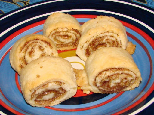 Roll up from the shorter end. Leave the seam side down and fold the ends under (I usually cut them off and eat them). Then cut into 1 inch pieces and put in an oven safe dish along with your pie (350 degrees works well) and bake for about 20-30 minutes.