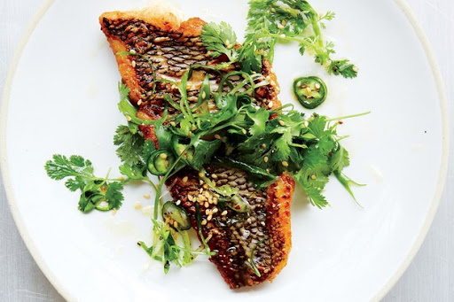 Meanwhile, toss scallions, chile, cilantro, lime juice, sesame seeds, and remaining 2 tablespoons oil in a medium bowl; season with salt. Serve bass with scallion-chile relish.