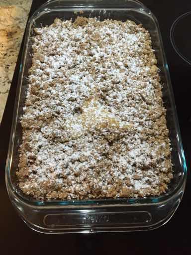 Using the second box of yellow cake mix, pour the dry cake mix into a bowl along with 1 stick of melted butter and 3 tablespoons of cinnamon. Mix together with a fork until the mixture has the crumb topping consistency. (If you feel like it's too dry you can add a bit more melted butter)