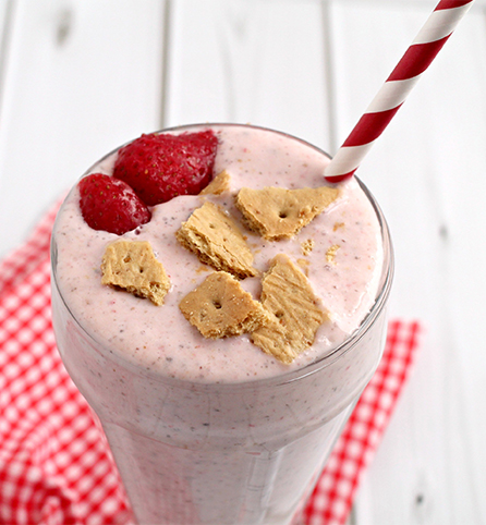 Pour into a tall glass and garnish with the reserved graham cracker crumbs. Add a frozen strawberry, if desired, and enjoy!