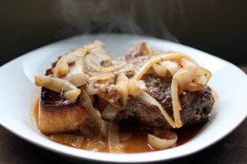 5. Serve steaks on Cheese Toasts with onion sauce ladled over. Garnish with parsley and Parmesan.