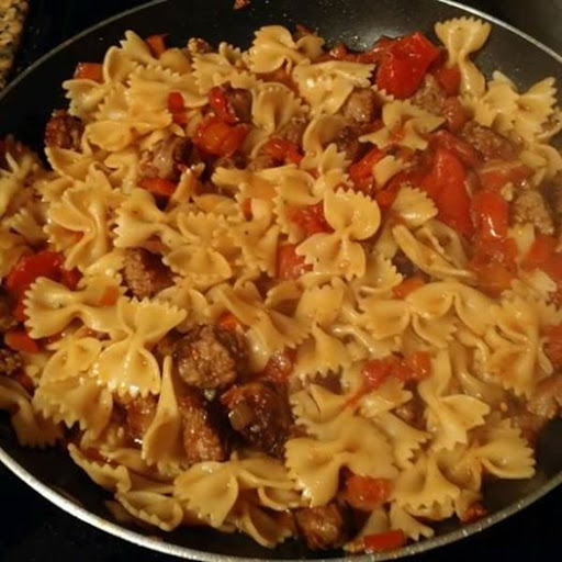 Stir tomatoes, beef broth, and Italian seasoning through the sausage mixture; bring to a simmer. Add bow-tie pasta to the sausage-broth mixture; simmer until pasta is cooked yet firm to the bite, 5 to 6 more minutes.