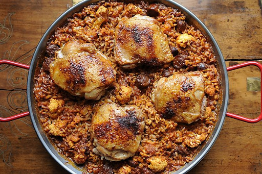 6. Add rice and distribute evenly across the pan. Add chicken. Add chicken stock. Add the rest of the spice mixture and season with salt. Bring to a boil and reduce to a simmer. Cook until rice is cooked through--I find this varies depending on the stove top--20-30 minutes. You can cover the pan if it is taking too long to cook. After it is done cooking let sit off the heat for 2-4 minutes. Serve.