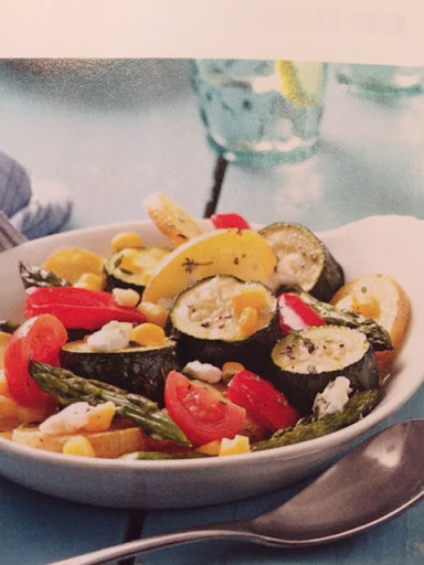 Preheat grill to medium-high. Toss potatoes, bell pepper, zucchini, asparagus and corn with oil; season with salt and pepper. Divide vegetables among four large sheets of heavy-duty foil; top each with a sprig of thyme. Loosely fold the foil over the fillings; then seal each packet closed using a double fold. Grill foil packets, covered, until potatoes are tender, 15 minutes. Drizzle with reserve vinaigrette.