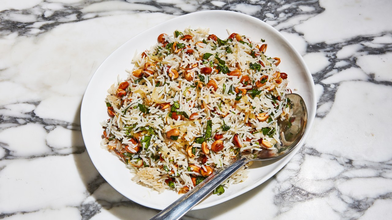 Heat vegetable oil in a wok or large cast-iron skillet over high. Add red and green bell peppers, garlic, ginger, and white parts of scallions. Cook, stirring constantly, until vegetables are just tender, about 1 minute. Add rice and salt, stirring to break up clumps. Cook, stirring occasionally, until rice begins to crisp, about 4 minutes.