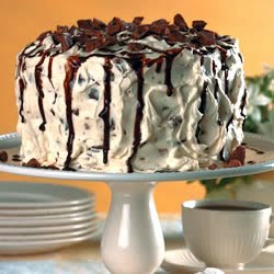 3.To make the amaretto whipped cream filling: Combine pudding mix, 1/4 cup amaretto liqueur and 1 cup amaretto flavored creamer. Set aside for 5 minutes until thickened. Fold the whipped cream into the amaretto mixture, then stir in the crushed chocolate covered toffee bars. Use to fill and frost top of the cake (do not frost sides). Drizzle cake with melted chocolate candy bar and sprinkle with sliced almonds. Refrigerate until ready to serve.