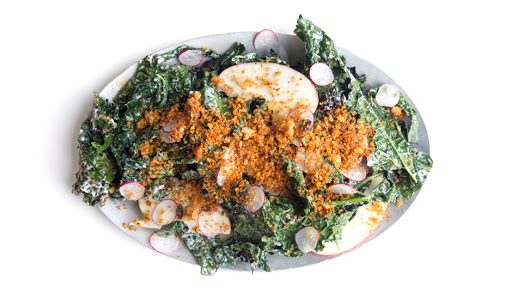 Prepare a grill for medium-high heat. Toss kale with remaining ½ tsp. kosher salt and remaining 2 Tbsp. oil in a large bowl to coat; massage leaves to soften. Working in batches, grill kale, turning often, until nicely charred and slightly wilted, about 2 minutes per batch. Transfer back to bowl as done and let cool slightly. Add apple and radish and toss to combine. Drizzle with dressing; toss again.