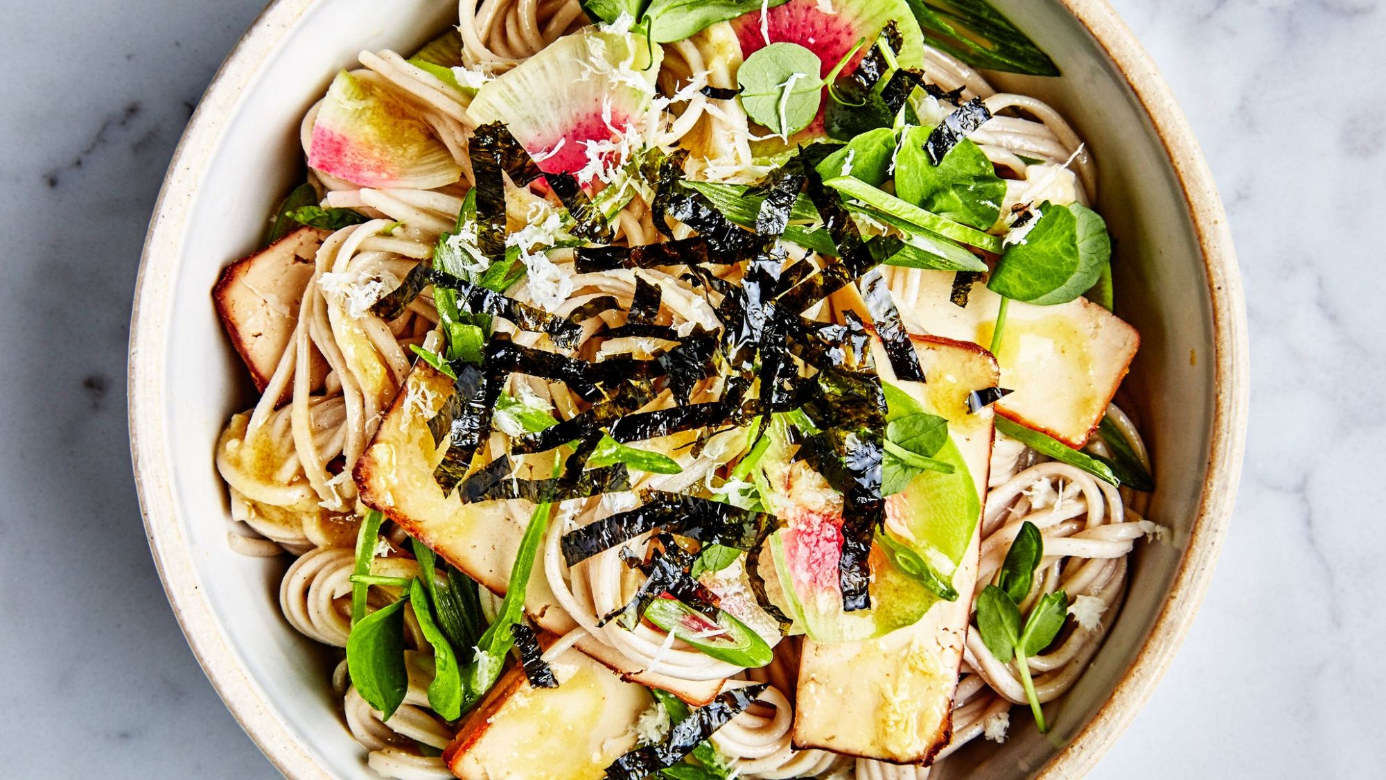 Recipe PreparationWhisk lemon juice, miso, mustard, maple syrup, garlic, and 1 Tbsp. water in a small bowl to combine. Gradually add oil, whisking constantly until emulsified; set aside.Cook noodles in a large saucepan of boiling salted water according to package instructions until al dente. Drain; rinse under cold water, then drain again.Toss noodles, scallions, tofu, pea shoots, sugar snap peas, and radish in a large bowl with three-quarters of reserved dressing to combine and evenly coat; season with salt. Top with nori and horseradish and drizzle remaining dressing over.Do Ahead: Dressing can be made 1 day ahead. Cover and chill.