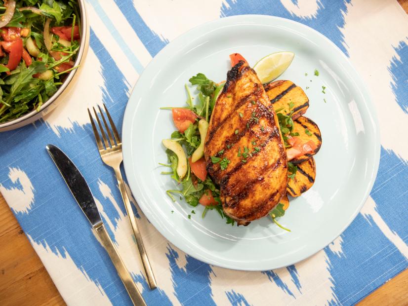 Arrange a few slices of grilled sweet potato on a plate, then top with some Tomato Cucumber Salad and lay a chicken breast on top. Repeat with remaining ingredients. Serve with lime wedges.