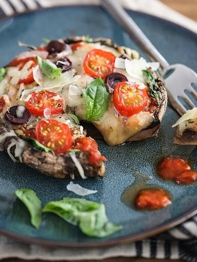 Spoon the pasta sauce evenly into the mushroom caps, top with the shredded or sliced mozzarella cheese. Top with tomatoes and basil (optional)