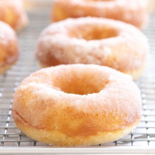 If you’re using the optional sugar-coating, invert the donuts onto a wire rack while they’re still warm. Dip each donut carefully in the melted butter and then press into the granulated sugar before replacing on the wire rack. The sugar coating will harden as it cools.
