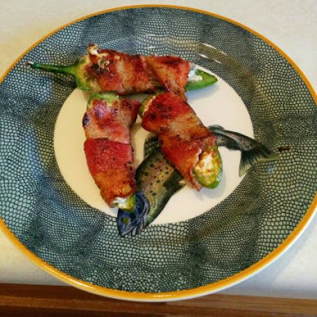Preheat grill or skillet to med heat. Rotate peppers to cook on all sides and cook until bacon is crisp. Serve hot or at room temperature.